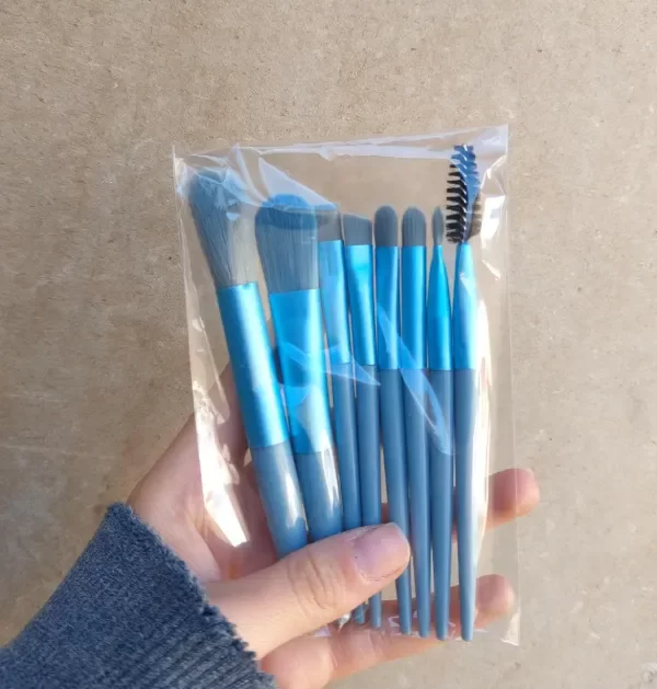 Set de brocchas de mango corto ideal para sombras y pestañas de la marca Tei contiene estruche semil cuero para transportarlo sin ensuciar nada, color celeste y gris.